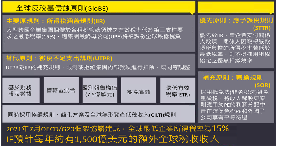 2021 年 10 月 G20 財長和央行行長會議前136國已達成全面性協議,OECD預計於2022年發布立法範本注釋,及解決GloBE規則與美國全球無形資產低稅所得制(GILTI)共存問題,並於2023年生效。