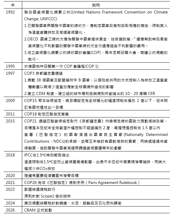 Change, UNFCCC)」,期透過締約方[註1]共識將溫室氣體[註2](Greenhouse Gas, GHG)濃度穩定在氣候系統不被人為干擾,且足以使生態系統能適應氣候變化下,並同時確保糧食生產與經濟發展的目標。但1996年聯合國氣候變化「政府間氣候變遷研究小組(Intergovernmental