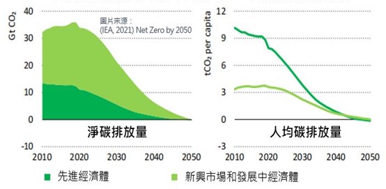 2021年COP26通過的決議係未來碳權買賣不可重複計算(double counting),即賣方售出的碳權,只算買方的減量成果,以及只有在2013年以後認證的排放量(Certified Emission Reduction, CER)才能繼續使用,讓《京都議定書》落日,進而啟動新的「碳排放交易機制」,讓各國能透過買賣「碳權」抵銷碳排,減輕自行減碳的成本壓力。國際能源署(International Energy Agency, IEA)2021年發表「2050淨零:全球能源部門路徑圖(Net Zero by 2050: A Roadmap for the Global Energy Sector)」,這是全球第一份能源系統達到淨零排放預測路徑分析報告,指出經濟發展不同,減碳時程會有所不同,如圖1所示,美、日、德等先進經濟體的總碳排量雖然相對低,但人均碳排量則高於印度、印尼、巴西等新興市場、開發中國家。因此,IEA指出全球要在2050年達到淨零排放,全球能源相關和工業過程產生的CO₂排放量在2030年將下降至21吉噸(Gt),其中先進經濟體在2045年就達淨零排放,2050年提供負排放,抵銷其他經濟體的排放量。 另外,先進經濟體人均CO₂排放量會從2020年8噸降至2035年的3.5噸,接近新興市場和開發中經濟體2020年的平均水準,到了2040年初兩者排放量大致相同,為每人0.5噸CO₂的水準。