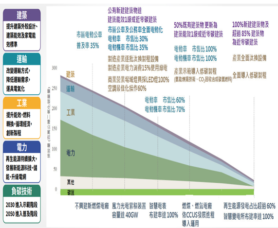 1 級或近零碳建築、市區公車全面電動化、電動車市售比達 30%、製造產業電力消費 15% 使用綠電、風力光電裝置容量達 40 百萬瓩(GW)等。到了2050