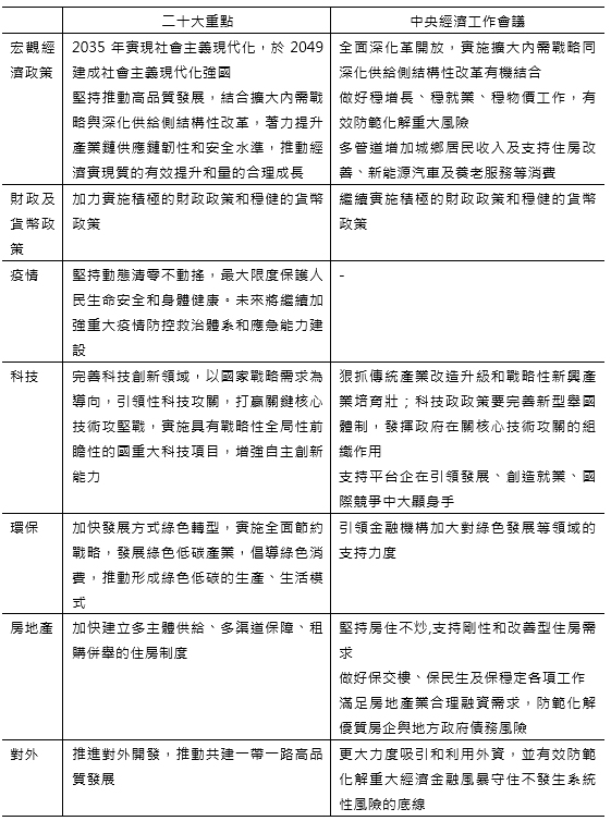 表1 二十大及中央經濟工作會議相關經濟議題論述