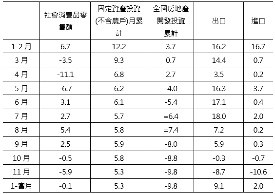在製造業與商業活動表現方面,受到各地疫情頻傳影響,PMI指數出現連續二個月跌落榮枯線之下,11月指標來到48.0%,為2022年以來次低水準,以企業規模來看,大、中、小企業PMI皆跌落榮枯線,分別達49.1%、48.1%及45.6%,顯示製造業經營活動動能失速。10月份非製造業活動指數來到46.7%,主要是受到疫情因素影響,服務業商務活動指數更降至45.1%,呈現連續三個月降速,服務業緊縮明顯放大。從行業別觀察,陸空運輸物流、住宿、餐飲、文化體育娛樂等行業商務活動指數皆低於38.0%,表示這些行業市場商務活動下降。
