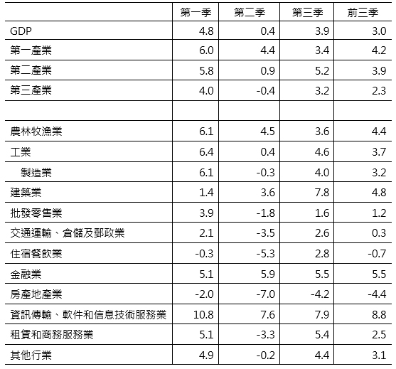 表3 中國2022年GDP年增率-按產業別