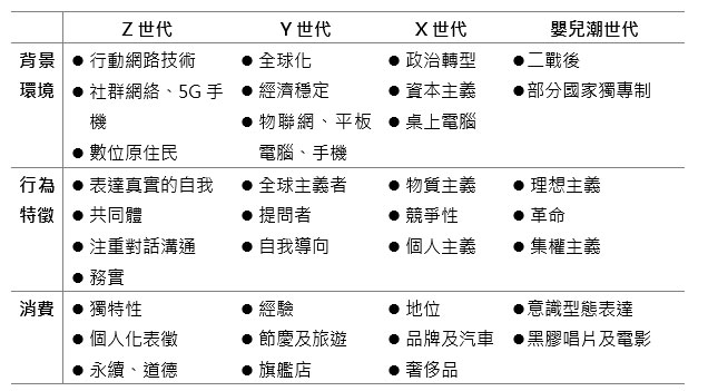 而麥肯錫(McKinsey & Company)研究如表1所示,Z 世代的核心行為皆基於追求真相(truth)。他們生活在經濟繁榮時代,是各世代中受教育程度較高的族群,他們注重個人意見的表達,但不像Y世代有理想化的自我意議,不太願意接受不同觀點,Z世代深信透過對話能有效解決衝突,讓世界變得更美好,因為他們可以從網際網路連接,認識不同國別、地區、不同領域與現實生活的朋友,運用行動資訊技術穿梭在不同社交媒體間,跟有相似目標或興趣者進行對話溝通,形成共同群體自我的認同。