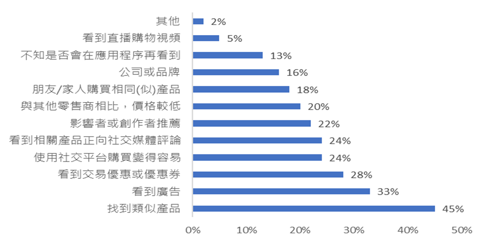 Trust Survey 2022)》顯示,Z世代會利用社交媒體購買商品的理由,有45%受訪者表示找到他們喜歡的商品。其次是看到庿告、交易優惠或優惠券,而影響者和創作者的推薦(比重占22%)、公司或品牌(16%)皆不是驅動Z世代在社交媒體購物主要動力,台灣較流行的直播購物因美國尚未推展,推動力仍低。這也突顯出產品發掘仍是Z世代透過社交媒體購買的首要原因。