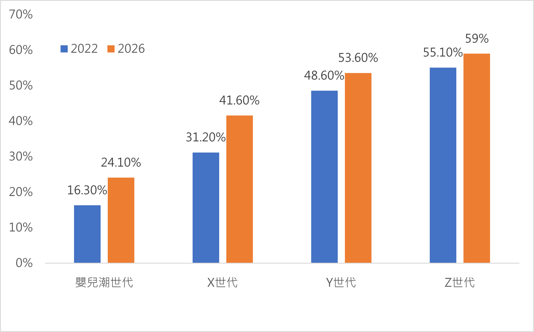 世代對替代支付方式最感興趣(用戶滲透率由2022年的55.1%提高至2026年的59%),是未來最有可能使用BNPL服務進行消費的族群。