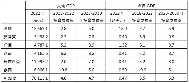 再從S&P Gobal公布的人均GDP觀察如表1所示,東南亞國家中僅新加坡高於全球人均GDP(12,669.1美元),其餘菲律賓、印尼等主要5國則低全球平均,在2018-2022年期間全球人均GDP複合成長率為2.8%,東南亞僅越南、印尼及新加坡成長較為快速,預估2023-2030年全球複合成長率5.0%,東南亞除新加坡外,菲律賓、印尼、越南等5國的人均GDP增加速度將高於全球表現。此外全球GDP年複合成長率,將由2018-2022年的3.7%上升至2023-2030年的5.9%,其中東南亞除新加坡複合成長率由5.5%縮小至5.3%外、泰國由負成長轉為成長5%,其餘4國GDP複合成長率高於全球平均水準,且擴張程度將加速。GDP,隨著東南亞經濟不斷成長和人均GDP提高,中產階層也逐步擴大,消費水準勢必也會隨之提升。