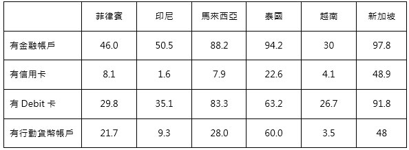 由於東南亞各國消費者差異性頗大,其支付習慣亦有所不同。依據DATAREPORTAL公布數據,如表3所示,東南亞金融機構為因應COVID-19疫情管制政策而簡化開戶程序,致各國擁有銀行帳戶比重提升,除越南及菲律賓律尚不及5成外,新加坡、馬來西亞比重在9成以上;但在信用卡持有率方面,主要受到個人信用徵信影響,僅新加坡有4成、泰國有2成以上持有率外,其餘國家消費者持有信用卡比率皆不及1成,反而是金融帳戶有錢才可使用的Debit卡的持有率最高,其持有率遠超過信用卡,其中以新加坡及馬來西亞消費者持有率逾8成居前2名;擁有行動貨幣帳戶比率亦高於信用卡,且泰國消費者擁有行動貨幣帳率比重高達6成。