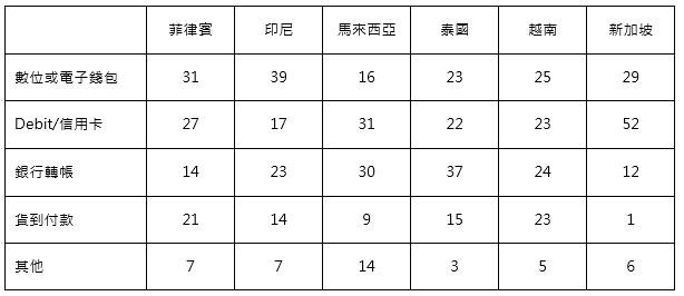 表4 東南亞主要國家消費者在電子商務支付方式