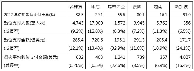 表5 2022年東南亞國家數位支付情形