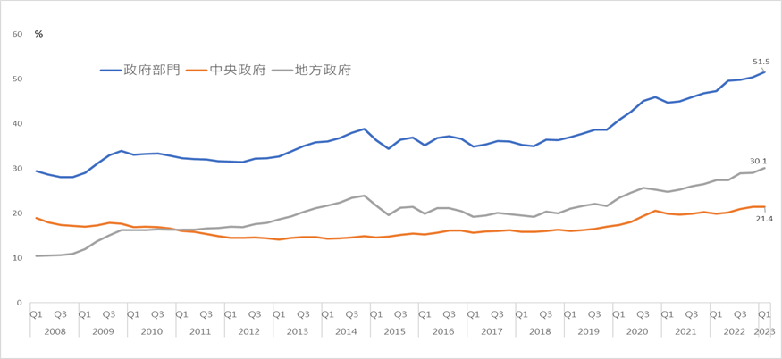 依據中國國家資產負債表研究中心(CNBS)公布中央及地方政府宏觀債務槓桿率資料,2000年以前地方政府債務槓桿率在5%以下,2008年為避免金融海嘯的衝擊,中央採取擴張性財政政策,透過內需刺激經濟成長,加上中國人民銀行要求地方融資平台承擔政府投資項目融資,使得地方融資平台相關的信用貸款和債券融資規模迅速擴增,地方政府債務槓桿率才由2008年10.7%跳升至2009年14.3%。2011年地方政府債務槓桿率已超過中央政府,並持續擴增。2019年底COVID-19疫情爆發,清零封控檢疫等支出大幅增加,加上房地產危機致地方政府土地出讓收入大幅減少,又讓地方政府債務槓桿率由2019年21.6%持續攀升,雖然2022年底中國解除封控管制,但地方政府債務槓桿率仍由2023年第1季30.1%升至第2季的31.2%,顯示即使中國解封,政府(含中央及地方政府)總債務槓桿率已逾50%情形不可輕忽的,債務問題持續對中國經濟發展帶來很大的隱憂。