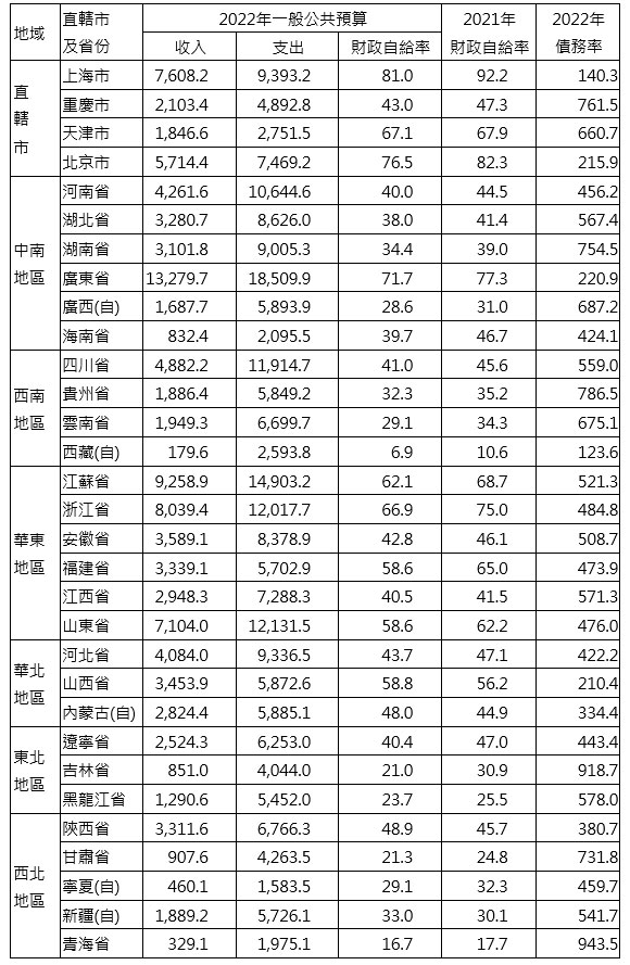 表1 2021-2022年中國各省及直轄市財政自給率與債務率