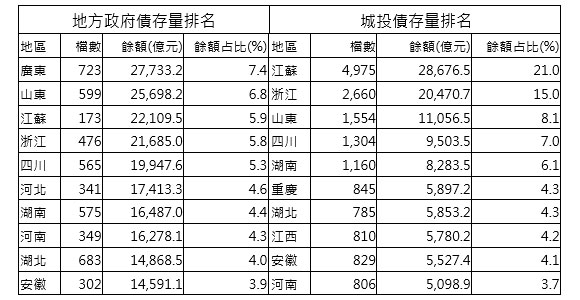 表2 中國地方政府債及城投債前十大省份排名