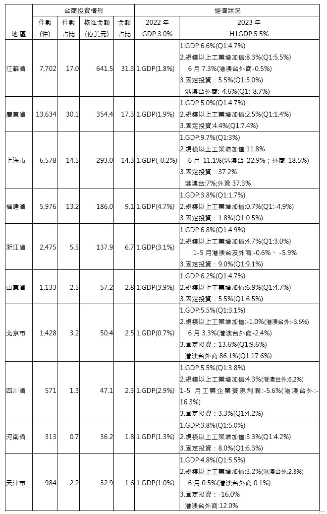 表3 截至2023年6月台商在中國主要投資的前十大地區及其經濟狀況