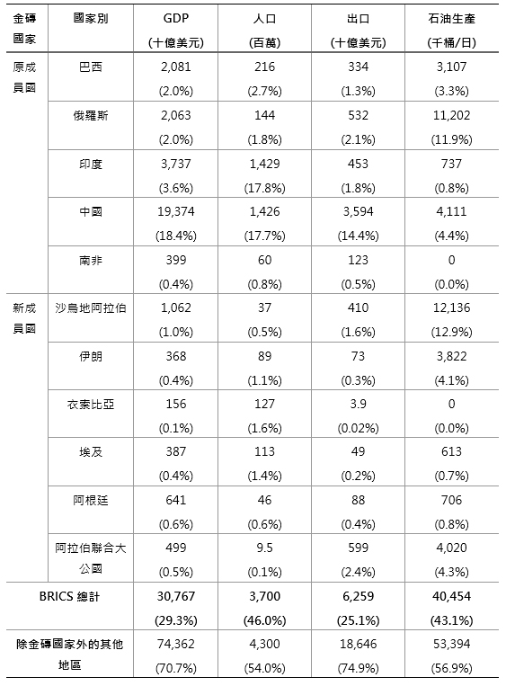 在經濟影響力方面,成員國從5個擴大到11個,形成經濟規模大的集團,如表1所示,到2024年,由11個成員國組成的金磚國家,其占世界人口比例從41%提高到46%,按購買力平價(PPP)調整後,占全球GDP份額將從33%提高到38%,全球商品出口比例也從20%增至23%。更重要的是新成員(特別是伊朗、沙烏地阿拉伯和阿拉伯聯合大公國)將使金磚國家在全球石油產量份額由現有的20%提高至43%。