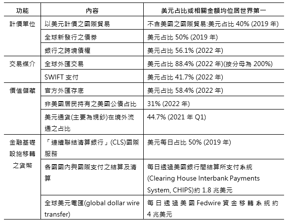 自第二次世界大戰結束以來,美元一直是世界主要儲備貨幣。根據美國聯準會研究報告[註4]指出 ,2022年美元占已披露的全球官方外匯存底的58%,遠超過歐元(21%)、日圓(6%)、英鎊(5%)和人民幣(3%)等貨幣,也凸顯出俄烏戰爭爆發後美國對俄羅斯制裁迄今,並未導致美元外匯存底出現重大的重新分配,即2022年外各國匯存底管理者在其投資組合中添加澳幣和加幣等多種貨幤,讓美元占全球外匯存底份額比2000年的71%有所下滑,但美元迄今仍然是占主導地位的儲備貨幣(如表2所示)。