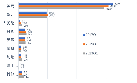 儘管美元現階段在交易媒介、計價單位元元及價值儲藏占比均為全球之冠,在可預見未來,美元將維持最主要國際貨幣之地位。不過,根據IMF官方外匯存底貨幣構成(COFER)[註6],如圖1所示,我們看到各國央行持有的美元份額正在下降,顯示各國為使外匯存底資產配置多元化,預先做準備。