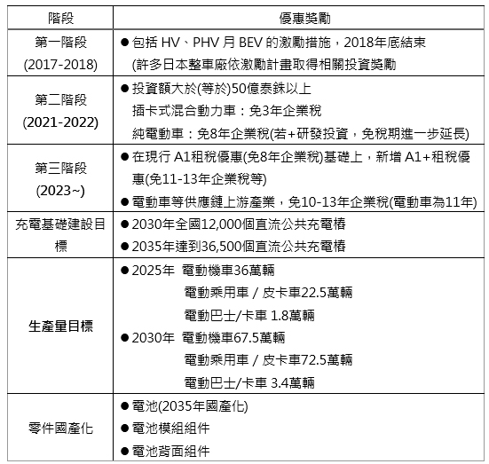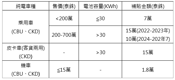 泰國投資促進委員會(BOI)推動電動車產業的作法,如表1 所示,第一階段(2017-2018年)針對純電動車(BEV)、混合動力車(HEV)以及插電式混合動力車(PHEV)等3種動力車皆享有包括免除企業稅年限不等,及設備進口免稅等促投優惠[註3]。第二階段投資獎勵措施於2021年推出,僅針對BEV及PHEV混合動力車2種車系提供優惠,包括長城汽車、比亞迪等中國電動車製造商獲得優惠。依據第三階段(2023年以後)規定,若電動車企業投資於上游供應鏈,則免稅優惠將延長最長11年,且要求接受政府補貼車廠,在2024-2025年前要完成在泰國當地生產,生產開始日期及所需生產整車數量規定為2024年產量應為2022-2023年進口數量的產量;2025年產量應為2022-23年進口數量的1.5倍,目前包括德廠BMW等公司已申請相關優惠。