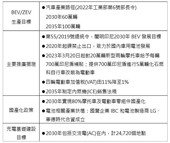 年目標60%,2026-2031年再增至80%;而四輪或以上的電動車TKDN目標為2022-2023年為40%,2024-2029 年60%,及2030-2031年的80%。因此,在進口優惠措施方面,包括電動車零組件、引擎按電動車排量及容量、電動車材料和機械等提供租稅優惠及免稅期等。另對認證奬勵方面,包括電動車電池產業人力資源、或電動車、車用電池及其相關產品等認證提供獎勵。在獎勵消費購車方面,自2023年3月起,凡購買在印尼設廠電動機車可獲700萬印尼盾補助,同時提供700萬印尼盾5萬輛化石燃油機車改裝電動車計畫,後改電補助再增至1,000印尼盾[註4];同理,自4月起購買電動汽車享有加值稅率(VAT)自 11%降至 1%之優惠。