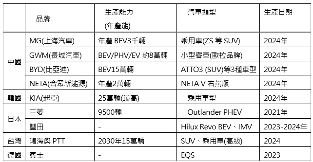 由於泰國政府規定購車補貼僅適用於符合BOI規範申請補貼的車廠車款,依目前泰國BOI公布車廠以中國車系最多,包括上汽集團(SAIC Motor)於2019年在泰國推出首款MG品牌EV車,並與泰國正大集團(CP)合作,投資5億泰銖擴建其在泰國現有的EV零組件及電池製造工廠;長城汽車(GWM)在2020年收購通用汽車工廠,斥資逾200億泰銖打造EV與混合動力汽車的區域生產中心,預計2024年生產廣受歡迎的歐拉好貓(Ora Good Cat)電動汽車;比亞迪(BYD)則投資179億泰銖建新廠,2024年開始每年生產15萬輛乘用車,產品分銷泰國、其他東南亞地區與歐洲等;合眾新能源汽車(Hozon New Energy Automobile)與泰國Bangchan General Assembly合作,從2024年起生產哪吒NETA V車型電動車等。日系車廠雖在泰國布局多年,但切入電動車時間比中國車廠晚,像三菱泰國廠於2021年起販售泰國廠生產SUV款Outlander PHEV;豐田則預計利用泰國中部豐田班坡(Ban Pho)廠,生產IMV(創新全球多功能戰略車)純電動車。韓國起亞(KIA)原來就與泰國Bermaz Auto合作組裝Carnival 和Sorento車系,目前已籌建美國、中國、印度、斯洛伐克和墨西哥以外的第6個生產基地家泰國廠,預計年產量達到25萬輛投資。德國賓士及BMW則預計生產豪華型乘用車款及電動機車等。台灣鴻海投入逾50億元資金與泰國國家石油公司(PTT)合資設立HORIZON PLUS電動車工廠,預計2024年5月量產,初期目標年產5萬輛,2030年產量提高至15萬輛。