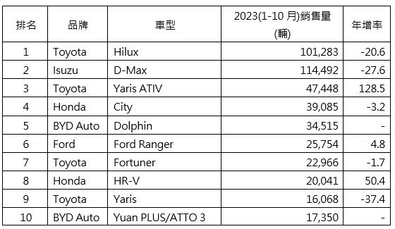 再觀察2023年1-10月泰國前十大新車銷量中,如表5所示Toyata的Yaris ATIV售價在53.9-68.9萬泰銖,加上座艙空間是泰國小型車(Eco