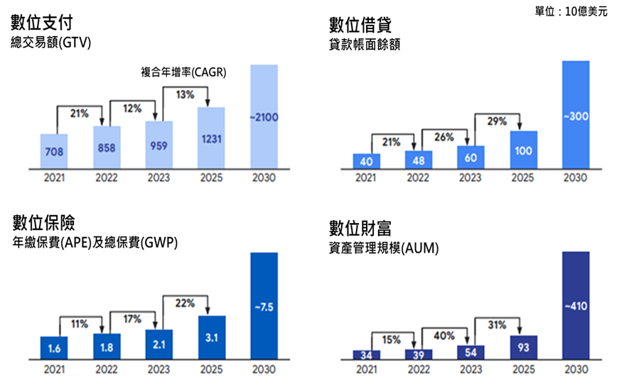 在數位借貸方面,貸款是數位金融服務最大的收入來源,高貸款利率雖增加資金成本,然近來數位貸款帳面價值呈現穩健成長,主要原因包括不符合銀行貸款資格的消費者及小企業,因資金需求而參與數位貸款,加上消費者偏好轉變,促使先買後付(BNPL)服務快速普及,另外還有東南亞傳統金融服務業的數位化,數位銀行崛起及各國政府不斷推動貸款領域的數位創新等因素,加速消費者使用數位化的借貸管道,2023年數位借貸帳面價值達600億美元,年増26%,其中8成是消費者借貸行為,預計2025年帳面價值將達1,000億美元,複合年增率29%。