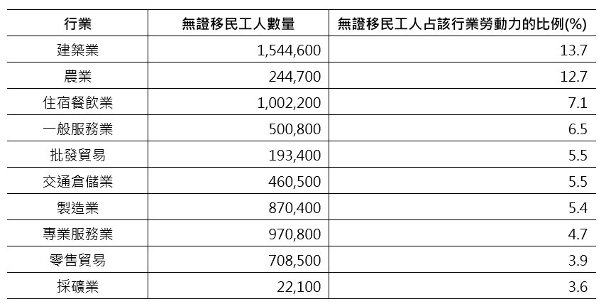 無證移民在美國勞動力市場中扮演著重要角色。2022年,89.4%的無證移民處於16至64歲的勞動年齡,相比之下,美國本土人口僅為61.3%。雖然無證移民僅佔全國人口的3.3%,卻貢獻了4.6%的就業勞動力,約750萬人。他們的勞動參與率高達75%,主要集中於建築、農業和酒店等行業(如表二所示)。如果實施大規模驅逐,建築業將損失150萬名工人,農業減少22.5萬人,酒店業失去約100萬人。此外,製造業、一般服務業(如汽車修理和乾洗)及交通倉儲業將分別損失87萬、50萬和46萬名工人。