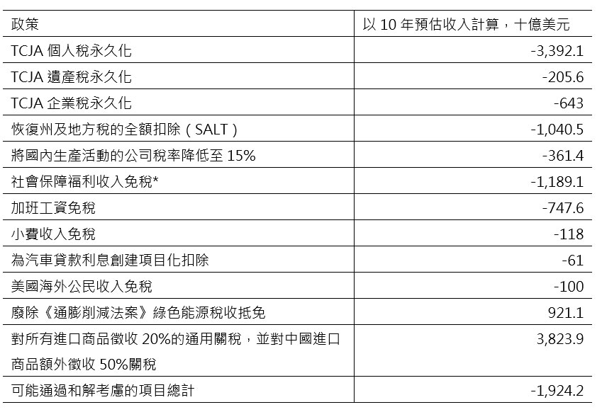川普和共和黨計劃延長《減稅與就業法案》(TCJA)的臨時條款,這些條款將在2025年後到期。根據稅收基金會估算,永久化個人、企業和遺產稅條款,將在2025至2034年間增加約4.25兆美元赤字;若考慮經濟成長效應,成本將降至3.59兆美元。川普還提議一系列減稅措施,包括取消州和地方稅(SALT)扣除上限、免除小費和加班工資所得稅、免除海外美國公民所得稅,以及將國內生產的公司稅率降至15%。這些提案將進一步增加2.4兆美元的收入損失。