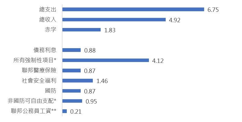 聯邦支出由三部分構成:債務利息、可自由支配支出和強制性支出(如圖一所示)。2023年債務利息高達8,820億美元,幾乎無法削減;可自由支配支出涵蓋國防和大多數聯邦服務;而強制性支出(如社會安全福利、醫療保險、食品券等)則占4.1兆美元,是成長最快的部分,由於醫療保健成本上升以及社會安全和醫療保險福利的人口老化,這些強制性類別的支出有所增加。2023年,強制支出相當於美國 GDP 的近 15%,而二十年前約為 10%。