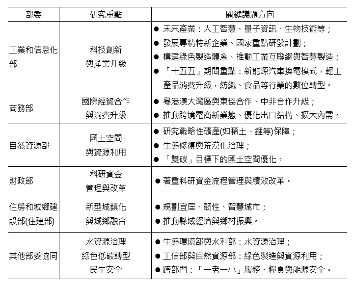 從各部委所展開前期研究重點及關鍵議題方向來看,如表1所示,主要涵蓋科技創新、綠色轉型、區域協調、民生保障等多項領域。從產業來看,突出科技創新引領產業升級,像工信部將推動智慧製造、工業互聯網、專精特新企業,而未來產業布局重點在人工智慧、量子資訊、生物技術等。在綠色低碳轉型方面,將深化碳中和路徑,生態環境部推動能源結構朝清潔能源轉型、自然資源部強化生態修復與資源利用。
