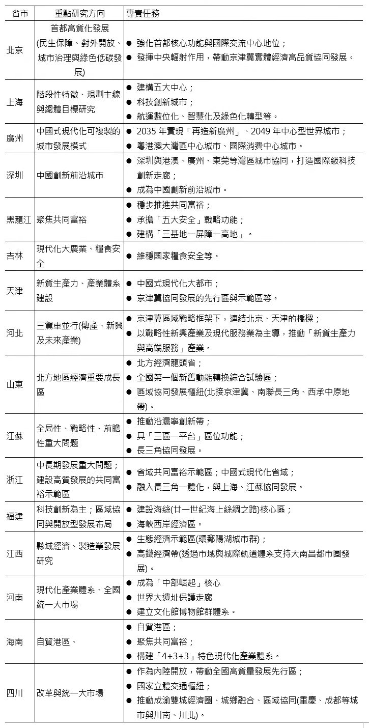 (二)各省市專責任務研究:依省市政策任務有差異性規劃,以下就一線城市及省份說明之。