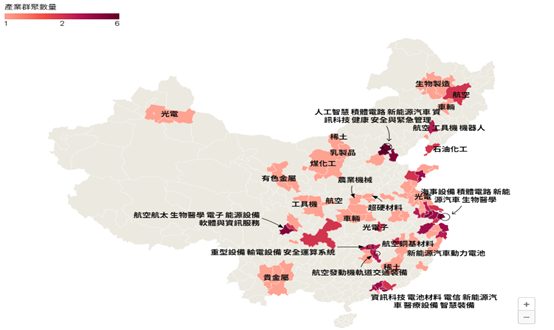依據中國工信部公布35個中國先進製造產業群聚如圖1所示,反映出中國在高端製造、新能源、智慧製造與數位、新一代資訊技術等領域在各地進行深耕布局,如四川(成德綿資陽—涼山航空航太)、黑龍江(哈爾濱航空)、遼寧(瀋陽航空)、山東(青煙威船舶與海洋工程裝備)等發展航空航太與船舶海洋工程裝備產業,作為中國高端製造提供支撐。在新疆(烏昌石)、江蘇(鹽常宿淮) 等地推展新能源與綠色技術,特別是在清潔能源領域。還有四川成渝生物醫藥、內蒙古包頭的稀土新材料等產業群等。