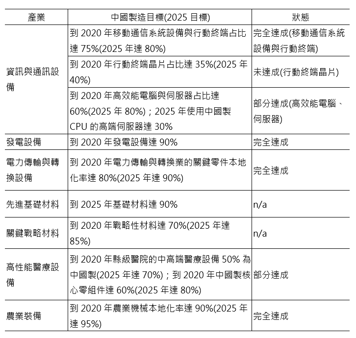 但在技術密集度與核心零組件要求更高的領域,如高效能電腦與伺服器、高性能醫療設備,中國僅能部分達成目標,在半導體的晶片領域明顯未能達成目標,此反映中國在高端製造與高科技、先進製程技術領域「卡脖子」困境依然存在。