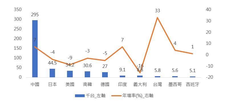 圖二 全球各產業工業機器人年度安裝量(單位:千台)