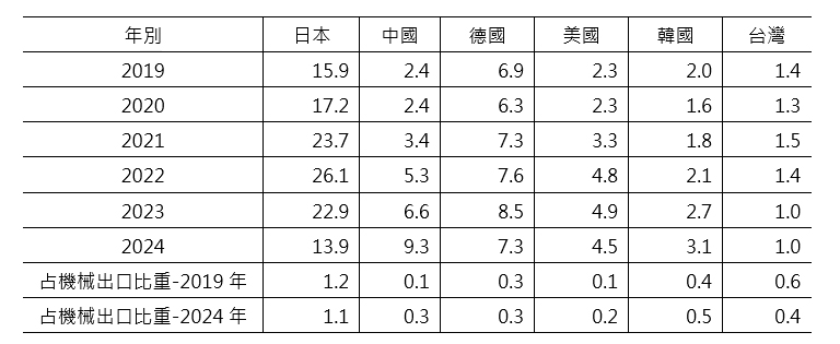 隨人工智慧浪潮推進,智慧化生產與機器人備受重視。如表一所示,日本向為機器人最大出口國,惟因生產技術未有明顯突破,2024年出口值不升反降;中國在機器人製造領域進展快速,出口規模超越德國居次,美國位居第4;占機械出口比重,僅日本占比超過1%,其餘國家在0.2%至0.5%之間。 累計2019至2024年間,中國工業機器人出口增1.4倍領先表列其他國家,其次美、韓各增22.8%、17.4%,南韓更因近年出口實績回升,順利突破前高,我國減3成,主因在機器人產業鏈偏重於零組件製造,部分以零配件或與其他機械設備整合出口,致未完全反映台灣機器人產銷實況。