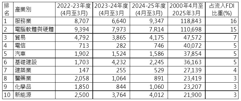 2000 年4月至2025年3月FDI投資印度產業數據顯示,依序為服務業(占總FDI比重為16%)、電腦軟體與硬體(15%)、貿易(7%)、電信(5%)與汽車產業(5%)居前五大產業,再次為基礎建設、醫藥、化學品與新能源等產業。前十大投資產業占總FDI額比重66%,表示FDI投資領域高度集中,且印度FDI已由早期單純製造投資,轉向結合內需市場、數位化與產業升級的多元驅動模式。