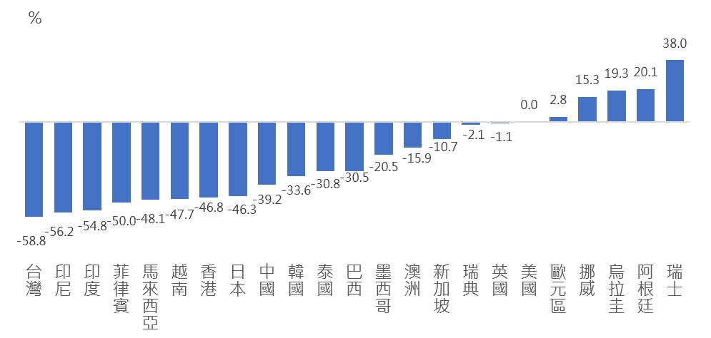 根據EIU對台灣經濟數據的觀察,「台灣病」相關病灶現象可歸納為四個主要領域。其一為匯率與購買力面向。EIU依據以GDP調整後的大麥克指標(Big Mac Index)[註1]指出,如圖1所示,新台幣兌美元匯率被低估逾五成,於調查國家中排名最後。EIU認為,此一低估程度已明顯偏離台灣強勁的經濟基本面,尤其過去五年來台灣出口表現極為亮眼,晶片與伺服器出口金額成長逾三倍,2025年迄今的經常帳順差(涵蓋商品貿易與各項跨境收益)已擴大至GDP的16%,遠高於2010年代約10%的水準。理論上,新台幣匯率應呈現升值走勢,但實際情況顯然並非如此。當一個大麥克漢堡在台灣的價格僅為紐約的一半時,表面上看似反映台灣物價相對低廉,實際上卻顯示匯率未能充分反映其經濟強度。這種長期處於弱勢的匯率結構,實質上等同於對出口部門形成隱性補貼。由於台灣經濟高度依賴進口能源、糧食與原物料,人為壓低的匯率亦形同向全體國民課徵一種「進口隱形稅」。因此,即便台灣人均GDP已突破3.8萬美元,國民在國際市場上的實質購買力,仍未能隨之同步提升。