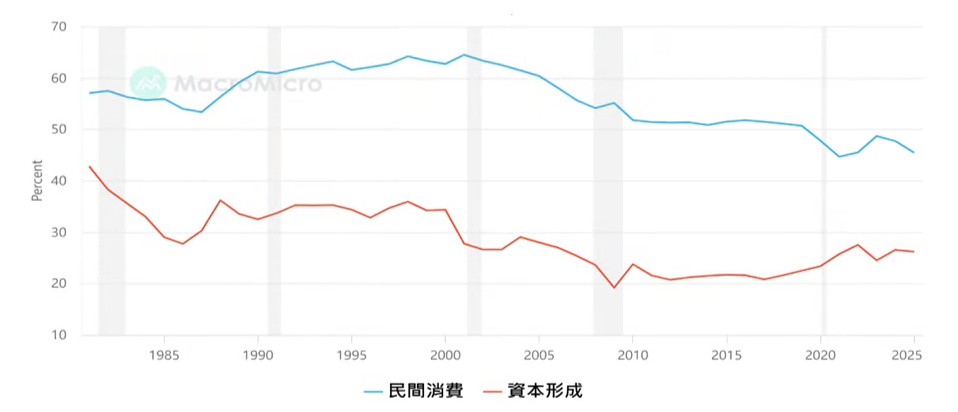 在內需與服務業層面,民間消費占GDP的比重自1990年代末期以來明顯下滑,反映經濟成長成果多集中於企業盈餘與資本報酬,而未能有效轉化為消費力。在需求端長期偏弱,且薪資成長又集中於少數產業的情況下,內需服務業遂陷入規模難以擴張、投資報酬偏低的惡性循環,進一步加深低薪、低消費、低投資的「三低」結構困境。即便該部門吸納大量就業人口,亦難以同步提升整體生產力與報酬水準。