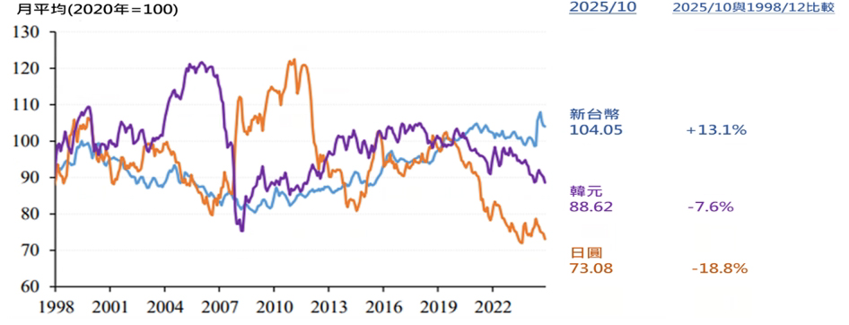 世界銀行及OECD均指出,購買力平價(PPP)主要用於衡量各國物價水準與貨幣購買力的相對高低,並強調PPP並不適合作為判斷匯率是否被低估或高估的依據。匯率係由外匯市場供需所決定,因此不宜僅以購買力平價或單一指標加以判斷,而應綜合考量資本移動、金融穩定及對外平衡等因素。依中央銀行統計資料顯示,如圖4所示,1998年底至2025年10月,新台幣名目有效匯率指數(NEER)累計上漲13.1%;相較之下,同期間韓元與日圓的NEER分別下跌7.6%與18.8%,且波動幅度較大。整體而言,新台幣匯率呈現長期走升且相對穩定的趨勢。